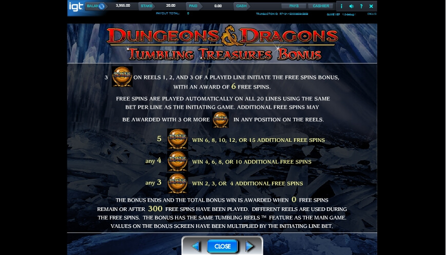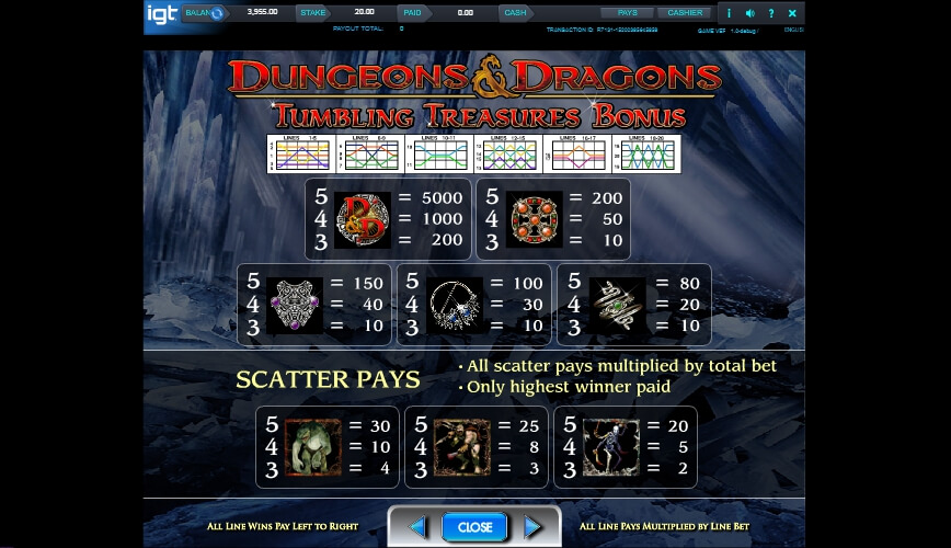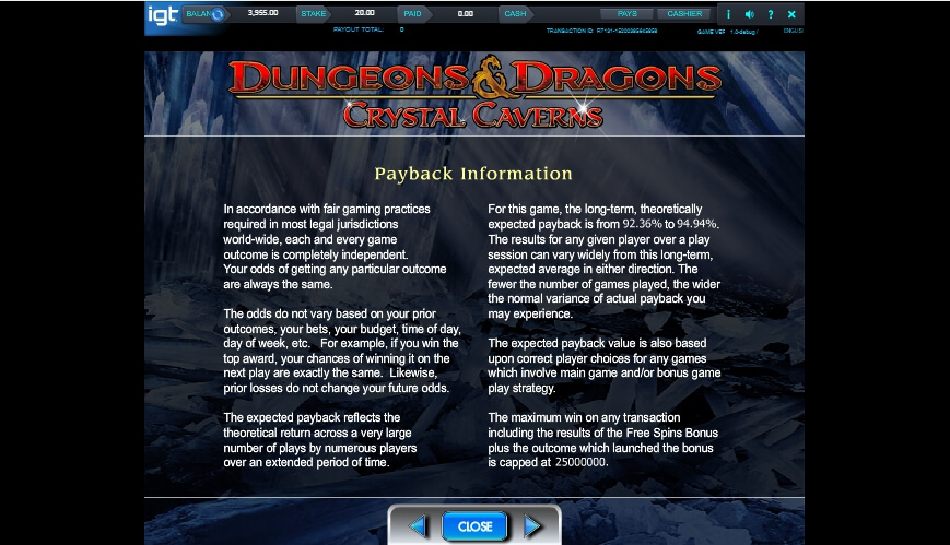 Like all slot machines from WagerWorks, the Dungeons and Dragons: Crystal Caverns slot has 5 game reels and 20 active lines. For each of them, you can put from 1 to 5 coins, but the range of available denominations of the wager is quite impressive – from 1 cent to 1 dollar. The slot machine also offers players to compete for a nice jackpot of 5000 game rates, and the chances of getting it are quite high because the slot’s payback ratio is 94.4%.