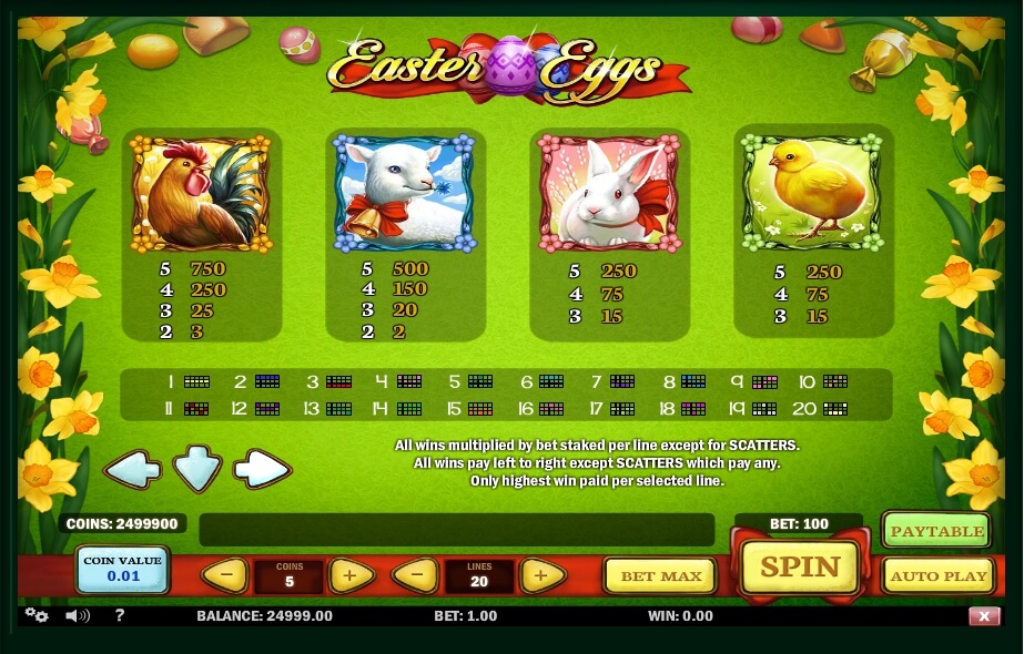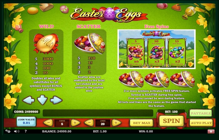 The game has certain advantages that stand out against the background of other modern slots that use a similar gaming theme. The advantages of Easter Eggs include the presence of three special characters, free spins with additional multipliers, a mode of risky and bonus games. First, we will talk about the free spins extra feature.