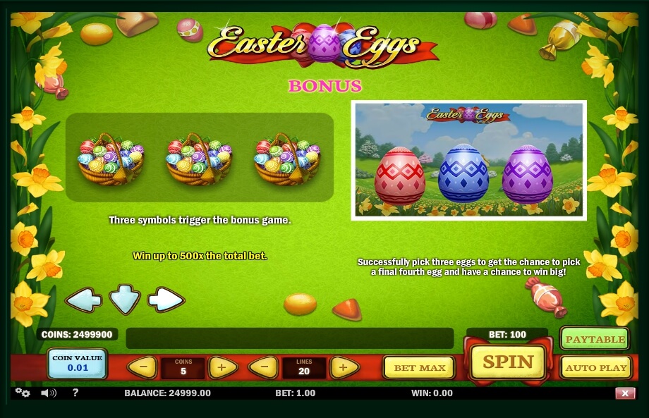 The bonus game consists in the fact that players need to select simply the Easter egg in which a certain prize will be hidden. This mode is activated by adding a combination of three identical BONUS pictures. A risky game here is standard, it is necessary to guess the colour or the suit of the inverted card. For the guessed colour, the doubling of the last win will be offered, and for the guessed suit multiplication of the win x4.