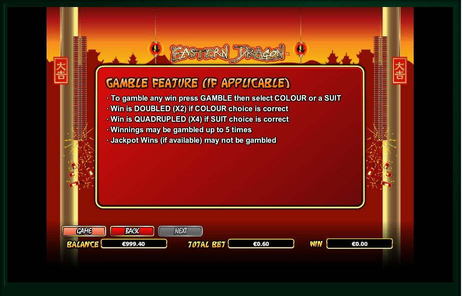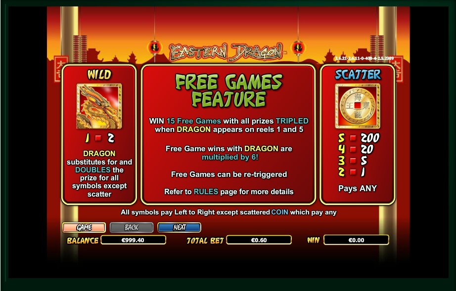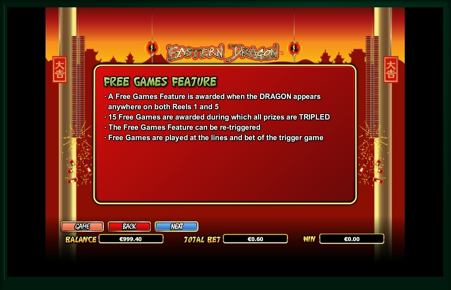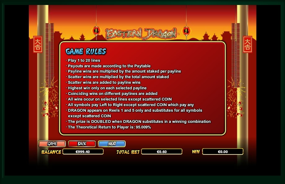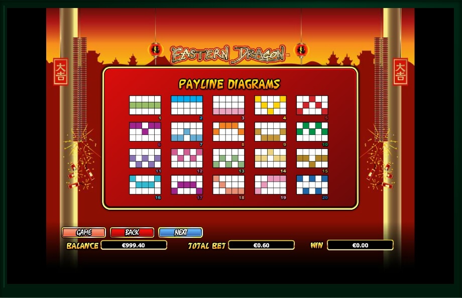 Eastern Dragon online gives the player a way to customize the gaming process. It is very easy to do that, with the help of special panel right down to the gaming reel. The “Lines” section can change the line on which you are going to put your money on. Click on the “Bet” box to choose the value of coins. These operations are totally enough, if you want to change spin the reel.