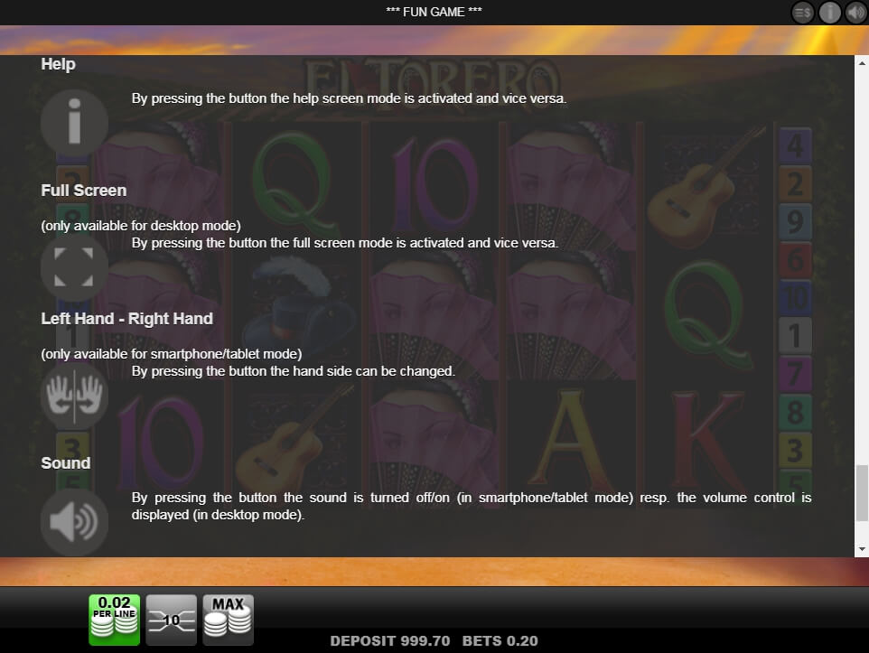 Game symbols in the form of pictures are represented by a hat and a mantle of a bullfighter, a flamenco guitar, a rose and a portrait of a fatal beauty watching a bullfight for a fan;