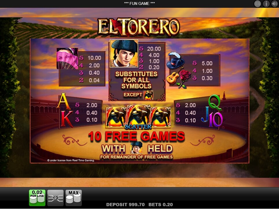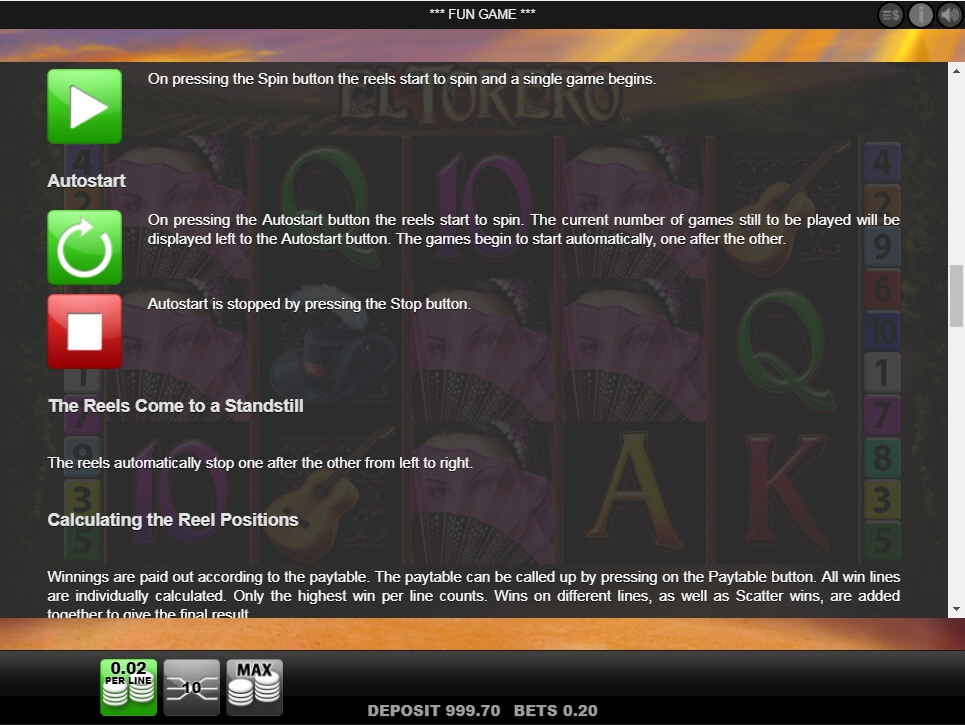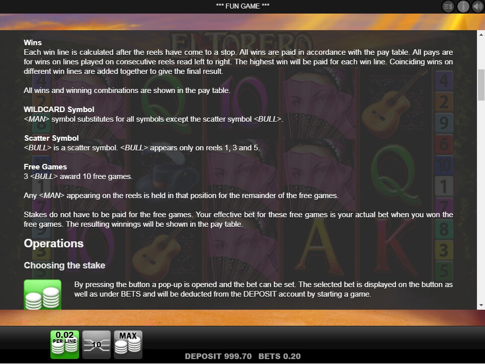 El Torero slot is a 5-reel model with 10 paylines and three rows of pictures on the screen. The layout of active lines is available in the rules. The slot machine has a fixed wager of 5 coins per line. In this case, the denomination of coins is in the range from 1 cent to 2 US dollars, which leaves room for maneuver both for beginners and experienced players. The jackpot is equal to 10 bets, and there is a pretty high chance to get it with a RTP of 96.08%!