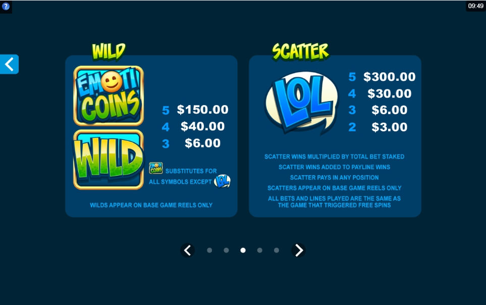 If yes, then read this paragraph slowly and thoughtfully. There are 3 goodies in the game:Game logo (The neon-blue text EMOTI (Instead of O there is a yellow smiling face.) is written over the light-green COINS.) is Wild, having a right to substitute all other symbols except itself and Scatter. EM:)TICOINS can make the winning combinations.