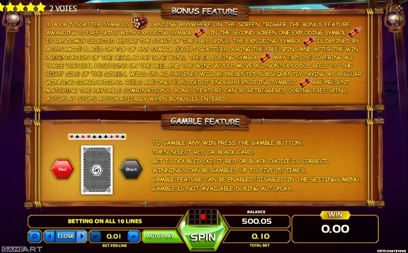 Dangerous cowboy life, stately horses and formidable sheriffs are the first associations with the Wild West period in history. Famous slot machines manufacturer, the GameArts Company, didn`t miss the chance to recreate the history of the forgotten period and return gamblers back in time. Now you can play the Explosive Reels casino online and completely immerse yourself in this amazing virtual world, enjoying huge winning sums. Moreover, if you want, you can practice without any registering or sending messages.