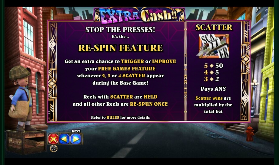 There is the possibility of auto-spins, you can set the number of lines with the help of the corresponding button, and on the slot itself. The game process is commented on in the table below the reels. The gameplay of the game slot Extra Cash is diverse, has many functions and special features. The main game consists of 50 paylines, which are regulated by up and down arrows, and 5 reels.