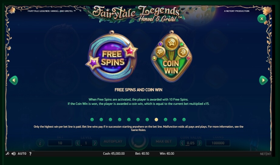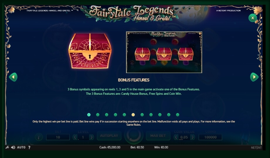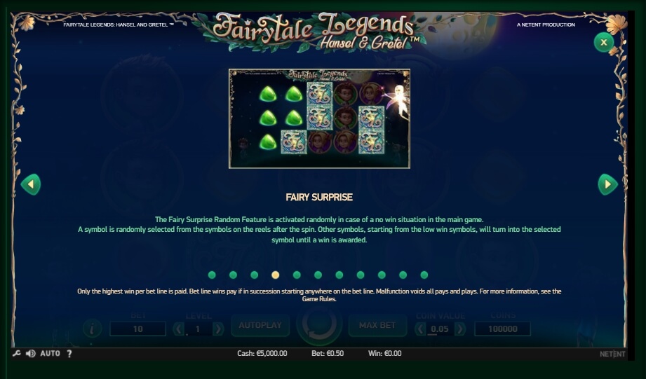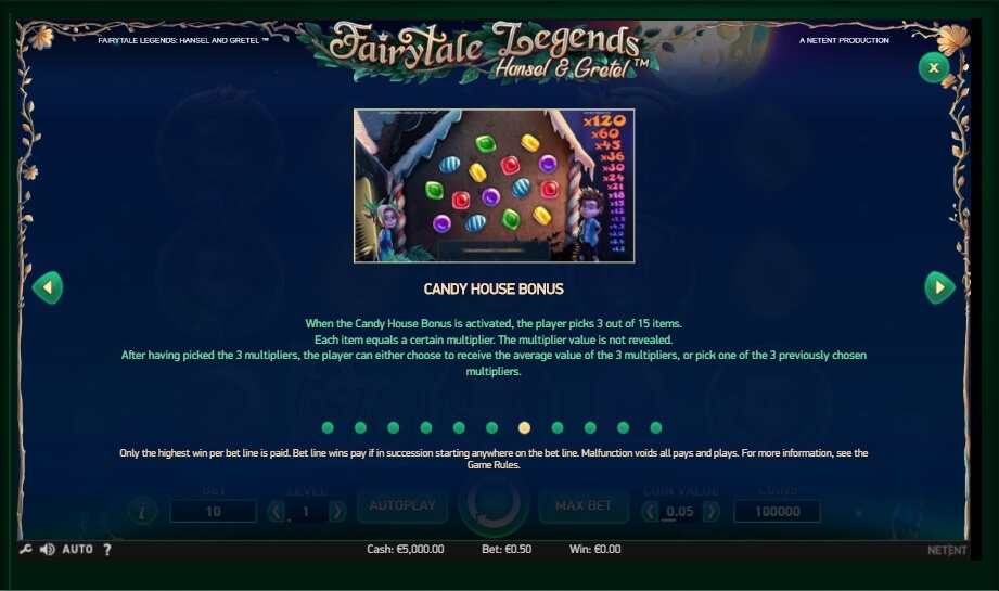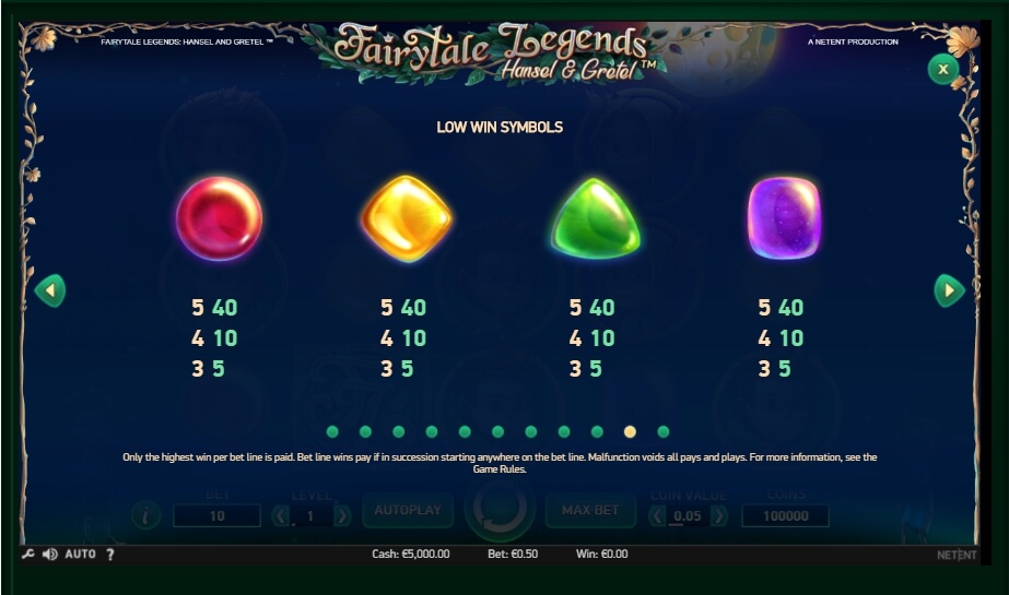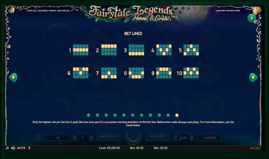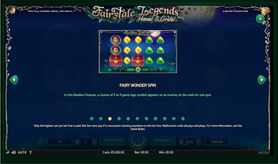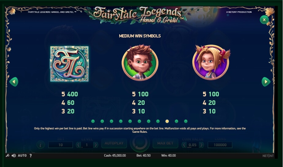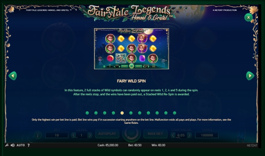 The Fairytale Legend: Gansel & Gretel casino slot has 5 reels and 10 possible active lines. On each line, you can put from 1 to 10 coins of the selected denomination, and the range of rates – from 1 cents to 2 dollars, which will please both beginners and experienced players.