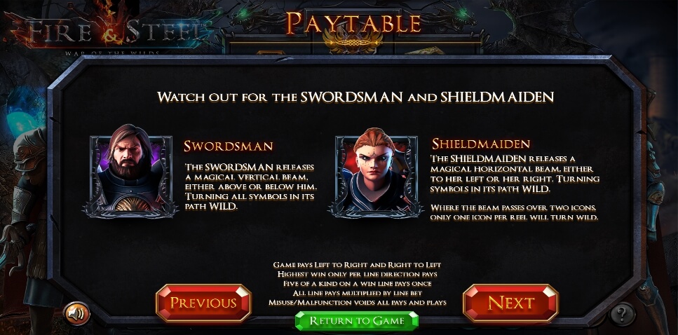 The Shield Maiden is the Second Wild, and it has the ability to expand horizontally by creating the beam of light, which destroys all symbols on the line.