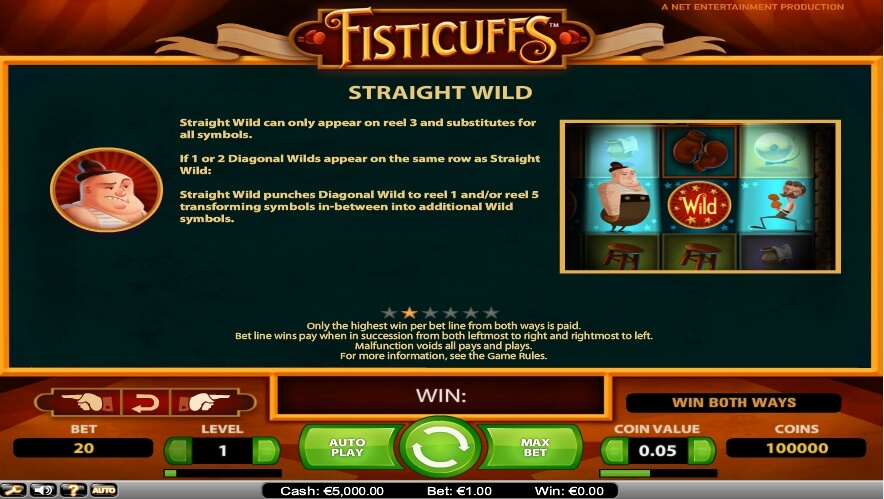 The gambling Fisticuffs slot has a traditional story for NetEnt slot machines. The bar under the drums provides access to the paytable and information table (the “Paytable” button), as well as information boards with the max possible amount of winnings and a reminder that combinations on the expanses of this slot can be added on both the left and right sides of the reels.