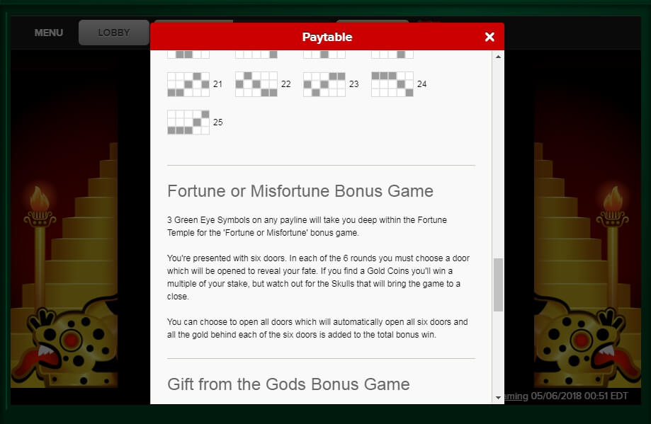 Among the symbols there is a bonus sign, which is a Gift of the Gods with a red or green stone inside. If such images appear on the field, the bonus mode immediately becomes active, in which the client will click on the ancient structures in the hope of a large reward.