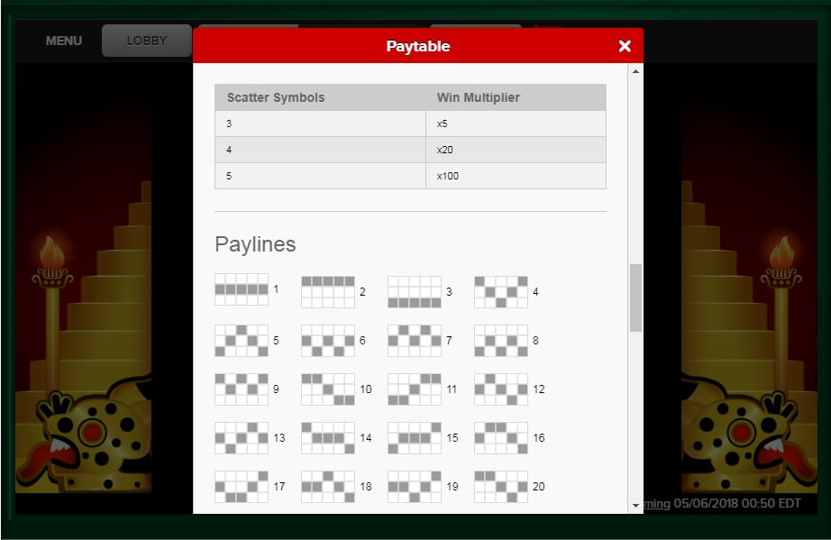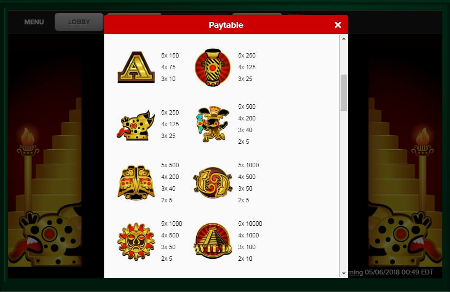 One of the famous architectural structures of the Aztec people is the pyramid, so its image will be very often encountered by the players. Actions unfold in the lost city of Eldorado, as symbolized by pictures of steps of gold. In addition, the overall style emphasizes the presence of thematic characters, as well as a mysterious melody accompanying the gamer throughout the 5 reels game with 20 lines for payments.