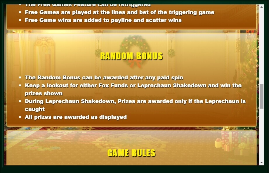 This Christmas video slot plays in 5 reels, where up to 25 active gambling lines, where the 3/5 location is to get a win, you need to match at least three characters. If the win amount on the symbol is low, then you need three, and if its value is high, then even two coinciding ones will give thevictory. The smallest sum is given for tens and nine, and the highest for kings and aces. In the table of payments there is a Christmas tree, money bills and a house made of gingerbread.