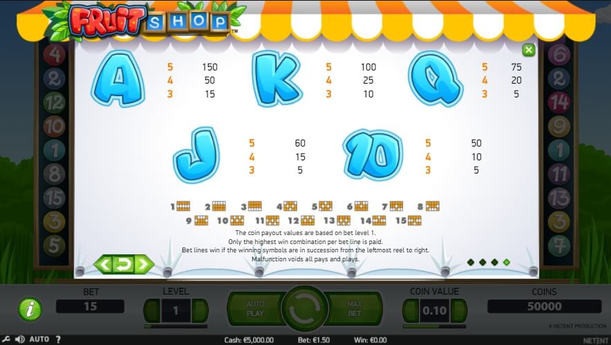 The Fruit Shop requires the user’s attention in determining such parameters as the bet in coins and the value of the coin. The first parameter helps to define the keys “more”, “less than” of the Bet Level field. The second parameter is defined in the Coin Value field. With any settings, the spin is triggered by a button located in the middle of the control panel.