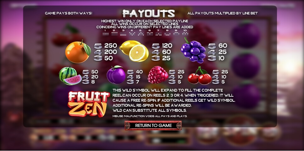 Fruit Zen online has a unique technique of signing in from any device. All player’s stats are kept on the cloud. That means, a gamer can access the slot machine not only from a personal computer, but also from a mobile phone, a tablet or anything else that can connect to the internet. Funny fact – players can also try this game for free. It is made possible by creators, who wanted to reveal the art of gambling to new gamers. Moreover, they succeeded. The game is very easy to be enjoyed even if you are a beginner.