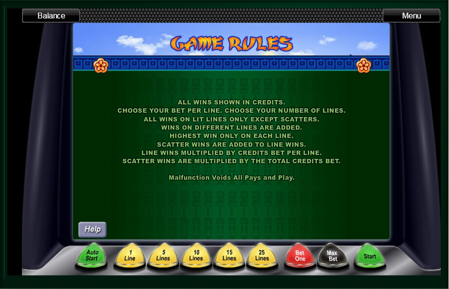 The next point we have to mention is one of the main slot characteristic. As you can see, Geisha by Aristocrat is a five-reel slot with twenty fixed active paylines. Each payline points out the way for the player to win.
