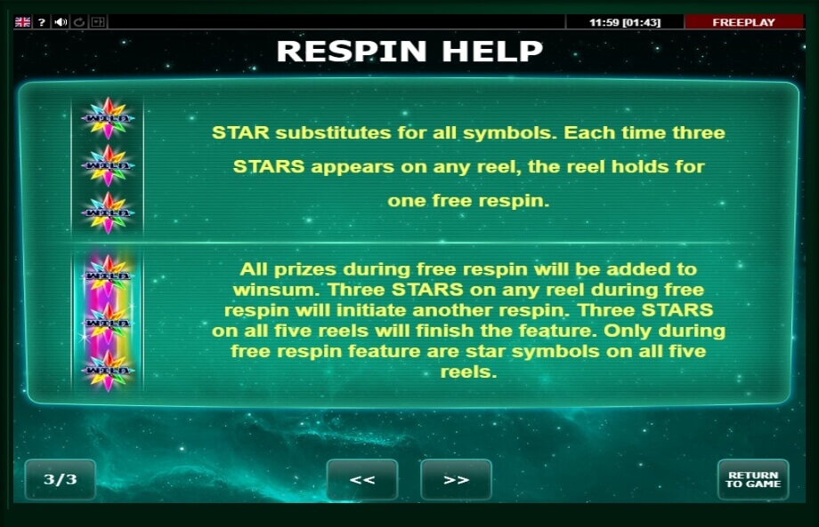 Turn on re-spins, collecting several multi-coloured stars. If there is one star on the screen, the player gets one re-spin. If there are two stars of this colour on the interface, players get even bigger amount of re-spins. However, luck can play a bad joke with a gambler. If there are three multi-coloured stars on the screen, re-spins will come to the end and this function will stop working!
