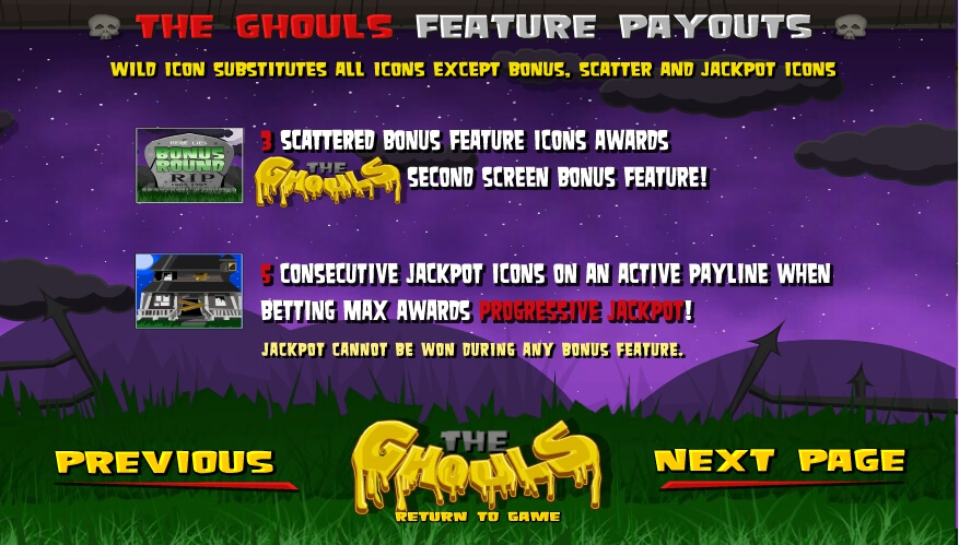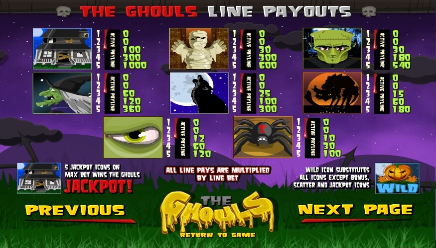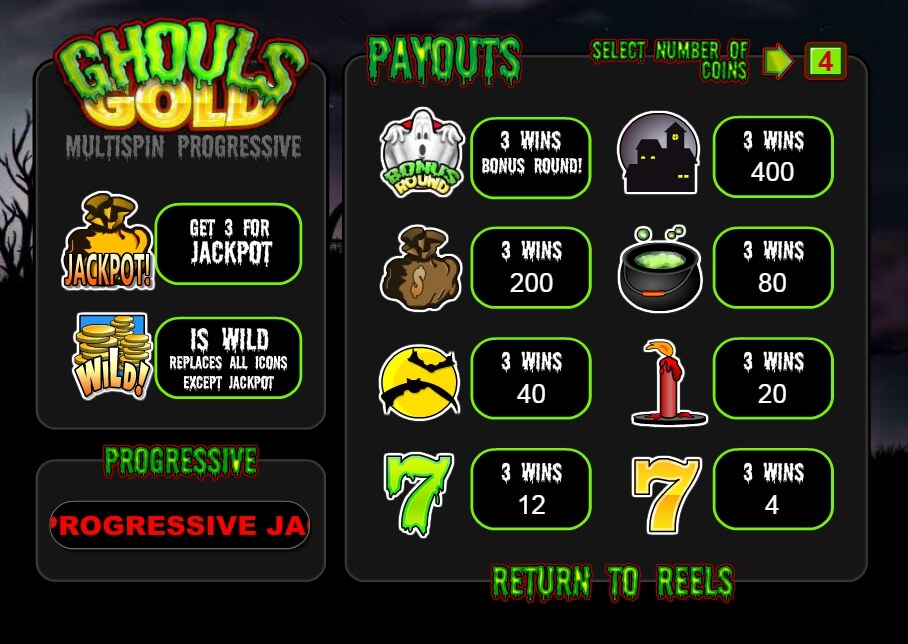 It is here that you will find the “Spin” button that will start rotating the drums. The bigger your bet, the more chances to win a progressive jackpot you have. The Ghouls Gold game is available on our site for free and without registration.