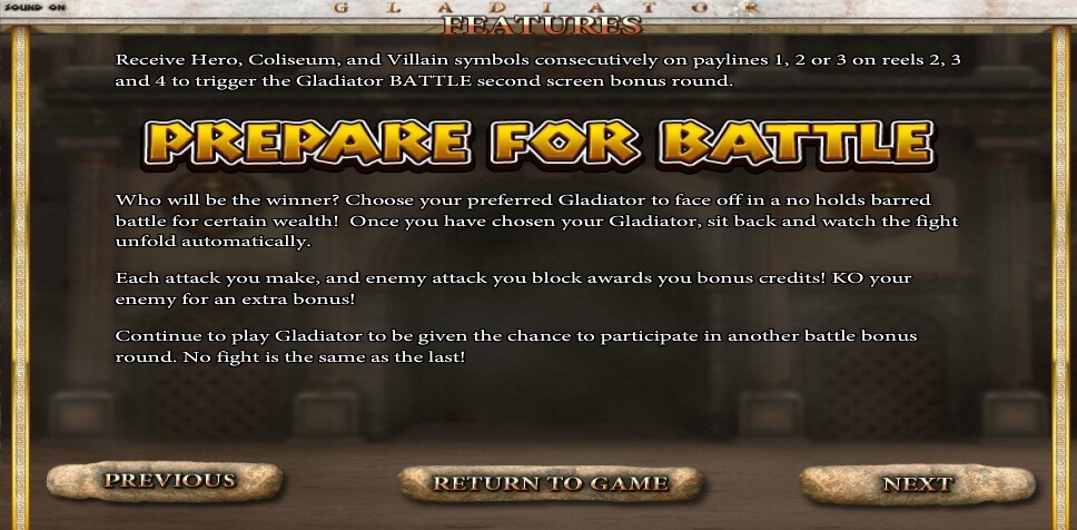 Before reaching the WILD SYMBOL, you will need a princess symbol (it can appear on any reel). After this, you reach the wild symbol option. Thanks to the graphics, equipping this online-game, you will see how it spreads the rose petals. Those icons touched by the petals will become WILD SYMBOLS with multipliers X2, which means that your winnings will double! Among others, the game has the option Gladiator Smash Wild Reel. It is launched when the hero of the warrior appears somewhere on the third drum. Here you will see amazing animation. The gladiator breaks the marble, and begins the bonus round. And the process of the game becomes more diverse thanks to the option Click me. There will not be anything complicated, and you will only have to click on the door symbols. With each click you will see how cash prizes appear. The game will end when the word Collect appears. To activate the bonus preparation option for the battle, you will need to find some icons of the hero, the Colosseum, and the villain on lines 1, 2, or 3 on the second, third, and fourth drums. Here you will need to make a choice between gladiators, and watch the battle. For each attack you will need credits, but you will receive points for each defensive move. The bonus game is fascinating and you can get it again. You do not even have to strain, just relax and have fun, watching how the battle unfolds.