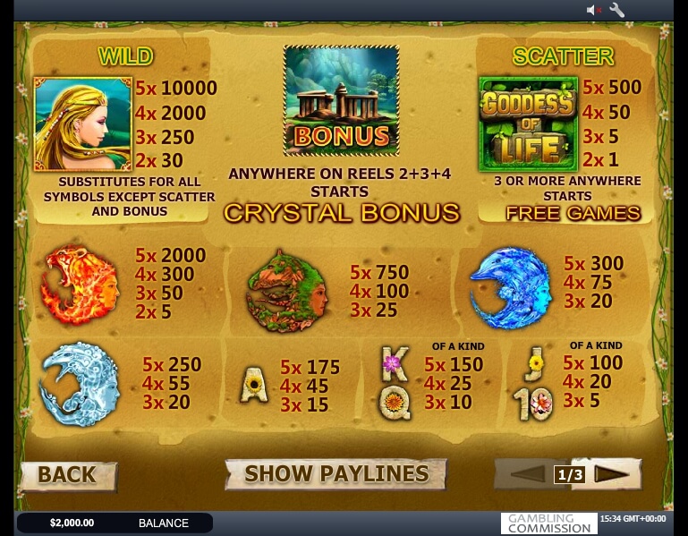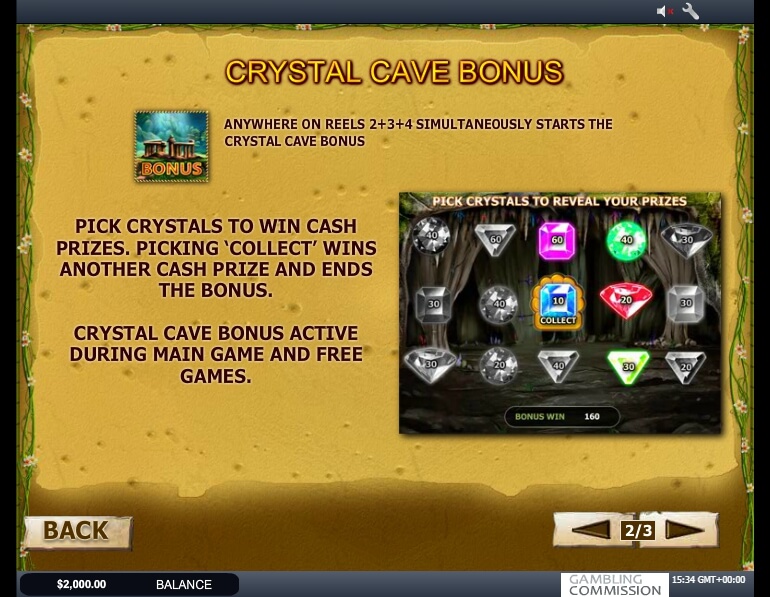 To take part in an additional level, the player needs to collect 3 logos. After that you will get a free rotation amount which will be determined randomly. In addition, payments for combinations with wild will be trebled. Bonus (the temple of the goddess) appears only on 2,3 and 4 reels and activates the bonus mini-game “Crystal Cave”.