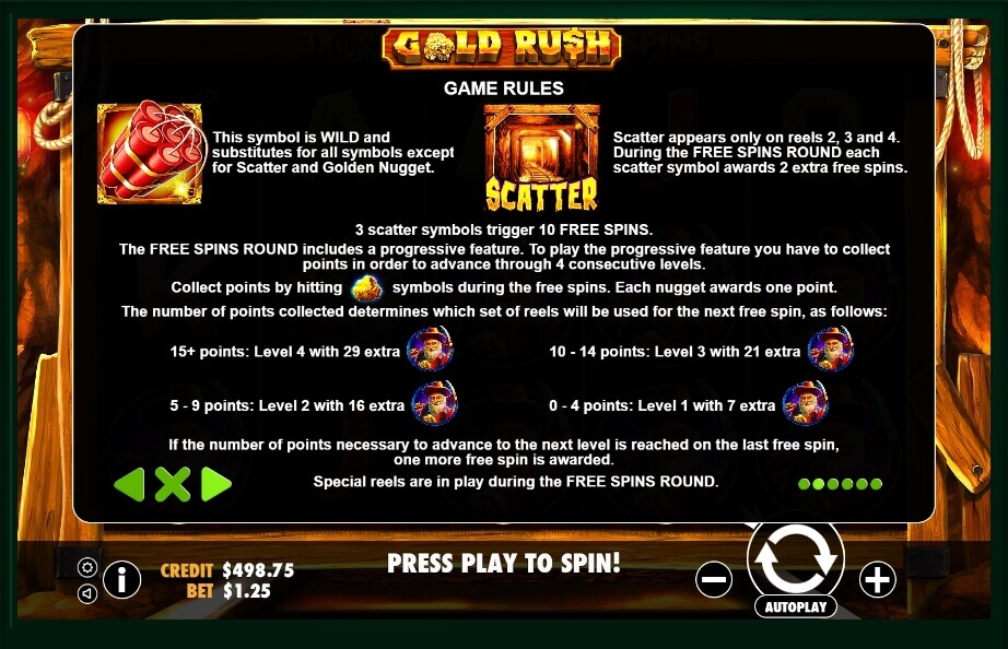 Wild (explosives) does not form winning chains, but it helps to form combinations of ordinary pictures. It can easily replace missing images. Scatter (mine) falls only in the central columns. If the player catches three such images, then he or she will take part in 10 free spins. During the round, you will collect gold nuggets.
