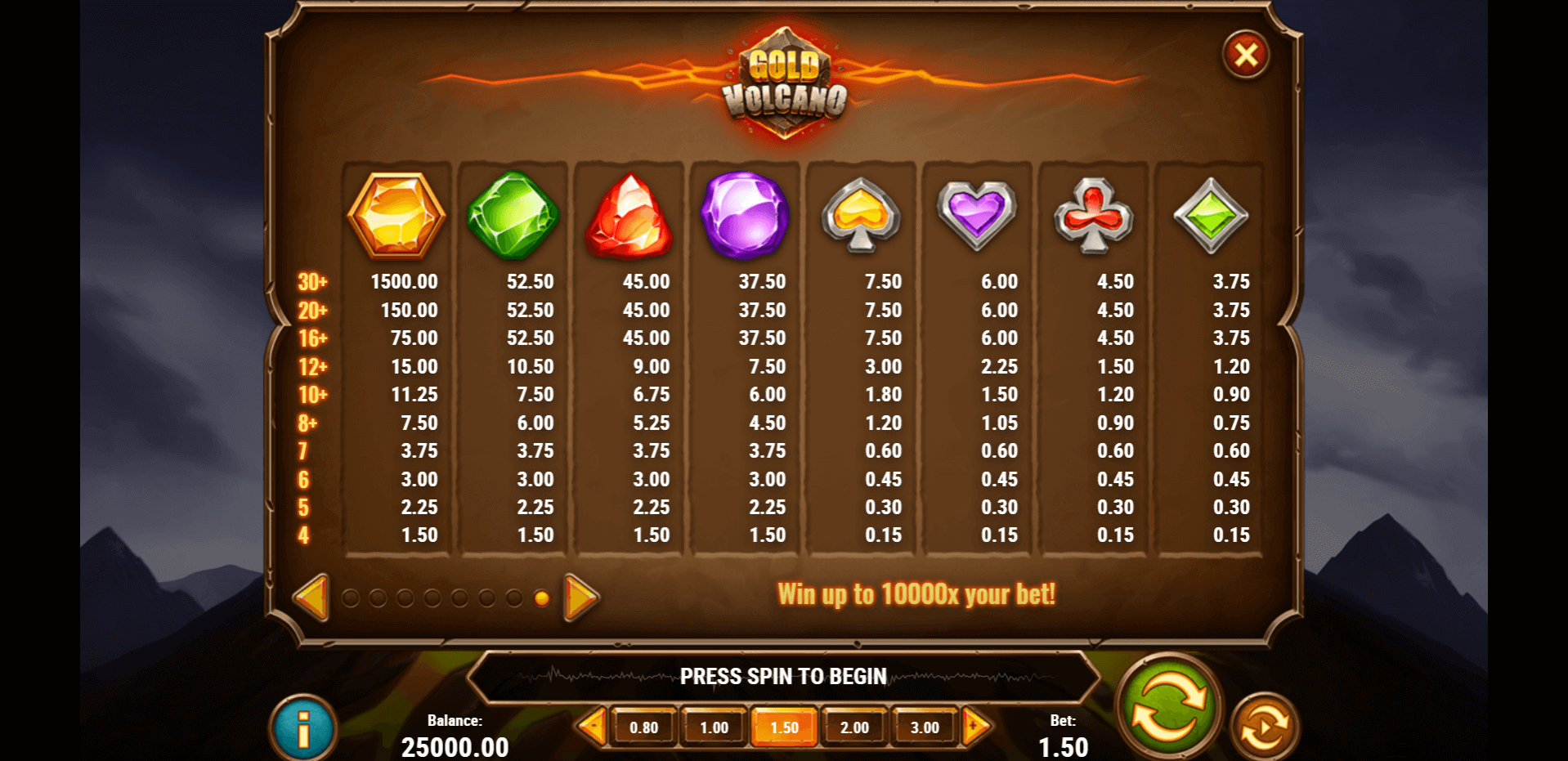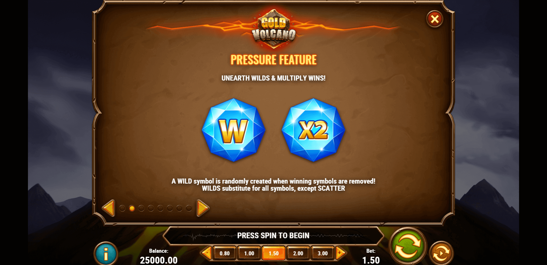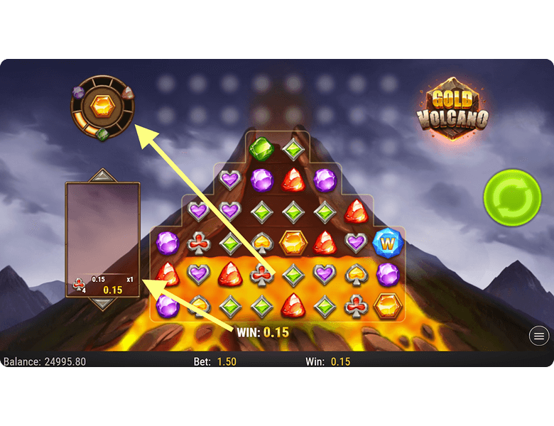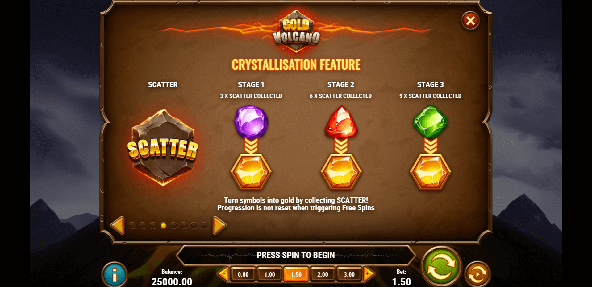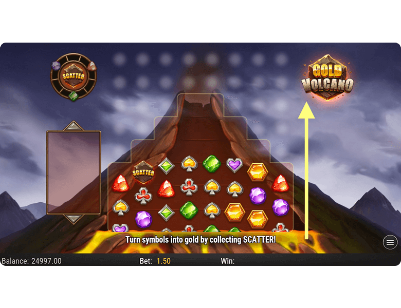 The Scatter symbols in the form of stones fill the counter next to Gold Volcano. The more of these stones that appear on the reels during a single spin, the further the crystallization feature progresses. This bonus has 3 levels: at the first level, all purple stones turn into gold, at the second, red gems transform, and at the third, all emeralds are converted. With each level, more high-paying nuggets appear on the reels, making it easier for the player to collect them into a cluster.