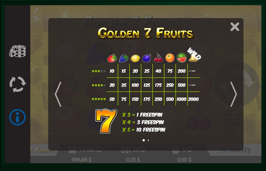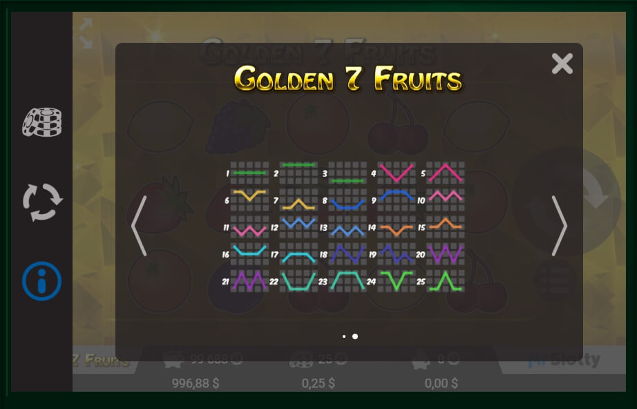 The Golden 7 Fruits slot machine is not like any other 5-reel slot although it has quite a classical range of features as will be discussed later on. For now, we should admit that this game has a whole bunch of win lines amounting to 25 paylines in total, which will give you many chances to hit high-value treasures.
