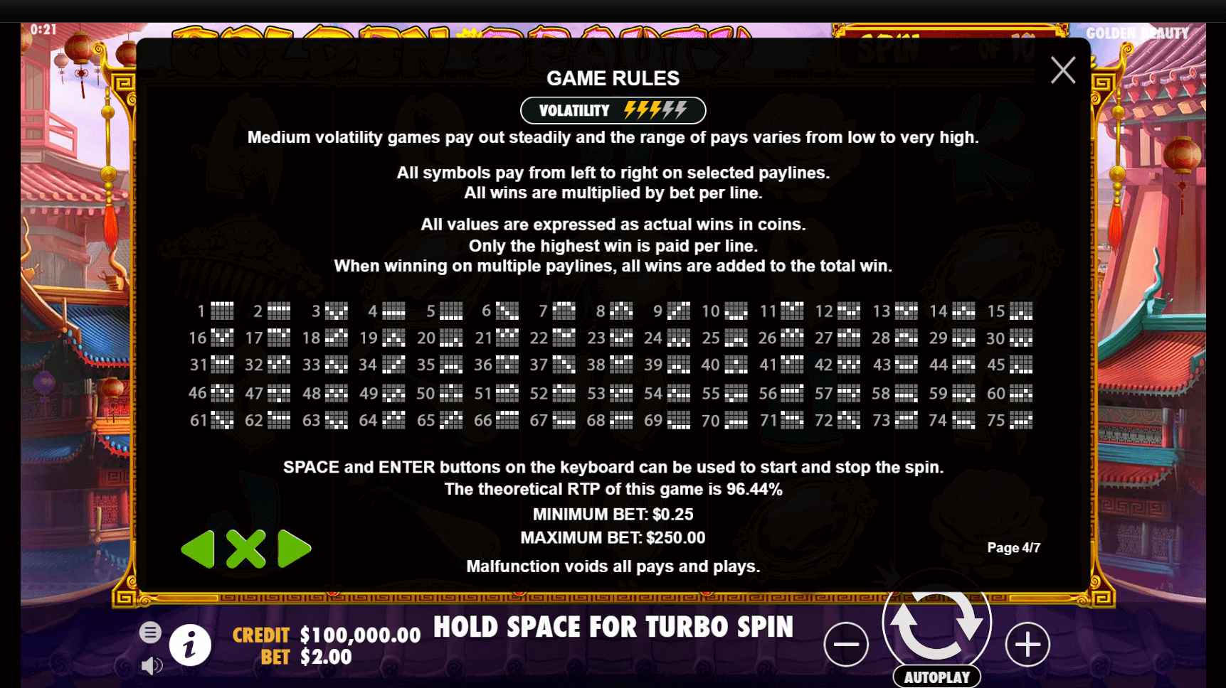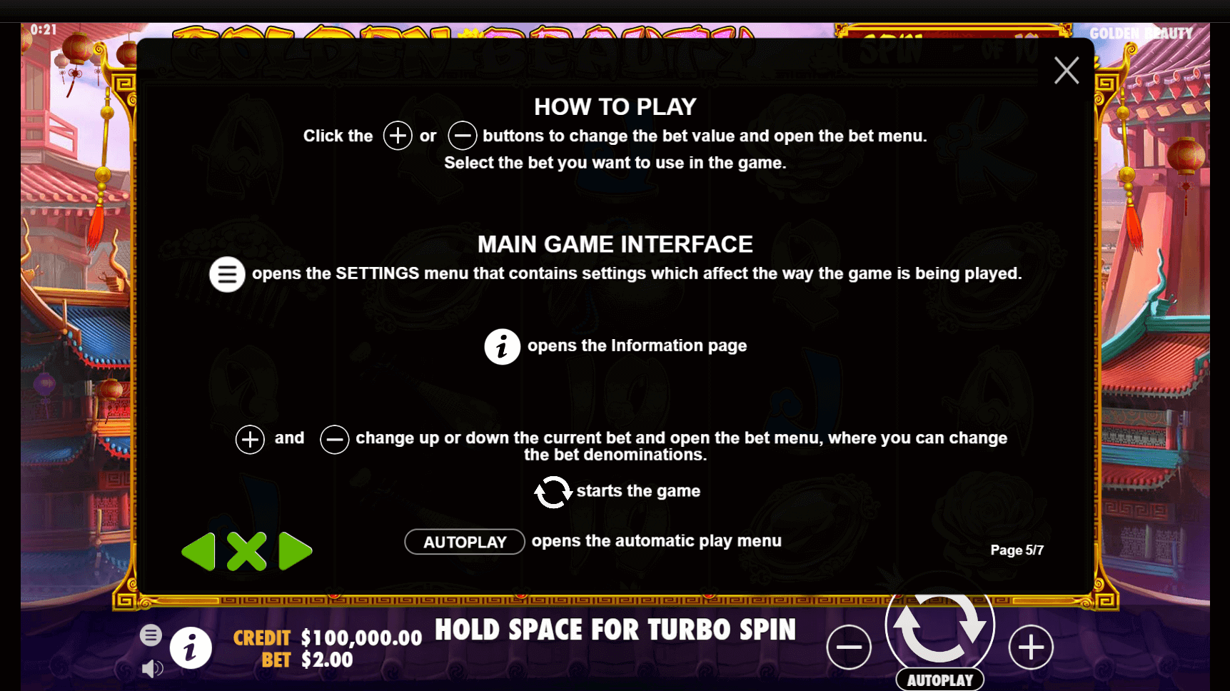 This Golden Beauty symbol is depicted as an elegant Eastern pagoda. It can appear on all reels and pays regardless of its position on the paylines. Landing three or more pagodas triggers the Free Spins bonus round, unlocking additional features and enhanced rewards. The more pagodas you land, the more free spins you receive — and the better the conditions become.