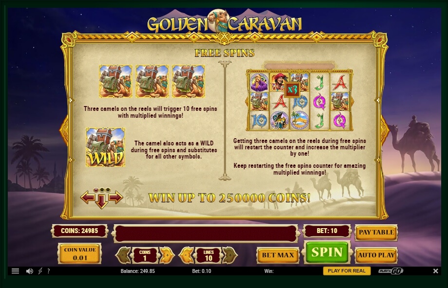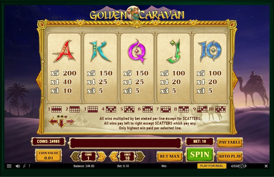 The control interface is simple and understandable. All necessary buttons can be found at the bottom of the screen. Golden Caravan is an entertaining video slot with a lot of add-ons and options. The main game has five coils and ten lines, which can be set using the Lines key at the bottom of the screen.