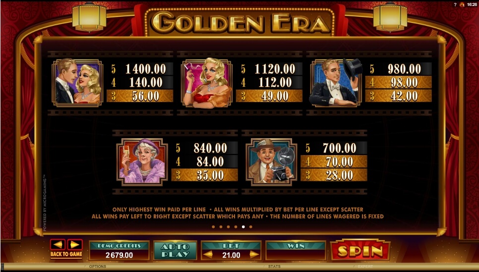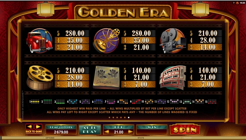 Almost all Golden Era Slot’s symbols are cinema-themed: few tickets with the text: ”SINEMA *** ADMIT ONE”; handprints of a famous person and down them an autograph are visible in a large metal ”brick”; a possibly ”movie” wound on a flat coil; a red vintage car with a white top and wheels; an exquisite golden trophy in the form of a human that is holding a movie reel over his head and a large grey motion camera.