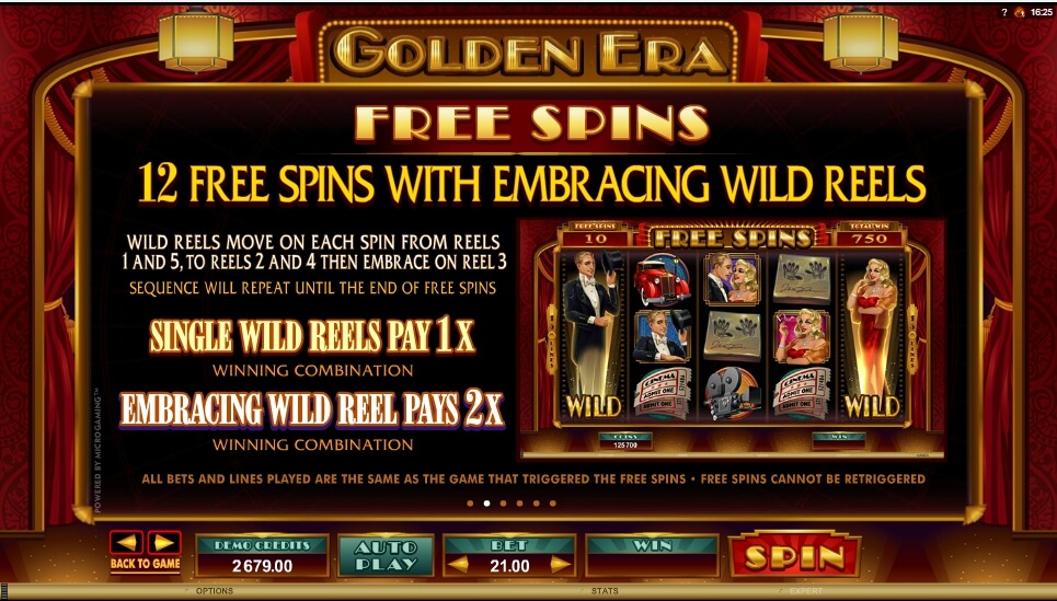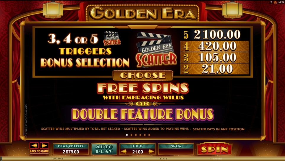 Standing next to each other are Syntia and James. ”GOLDEN ERA” is a logo and also wild here. Find 3+ ”Clapper board”s and (oh, magic!) you will have a choice between ”Double Feature Bonus” (is interesting because of playing with 10 movie posters) or not re-triggered ”Free Spins”.