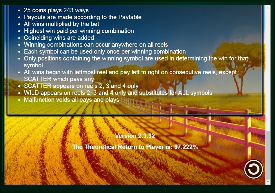 All 243 pay-lines are fixed and cannot be adjusted by the gambler. Above the purple columns, the player can notice information windows: the Balance, the Total Bet, and the Win.