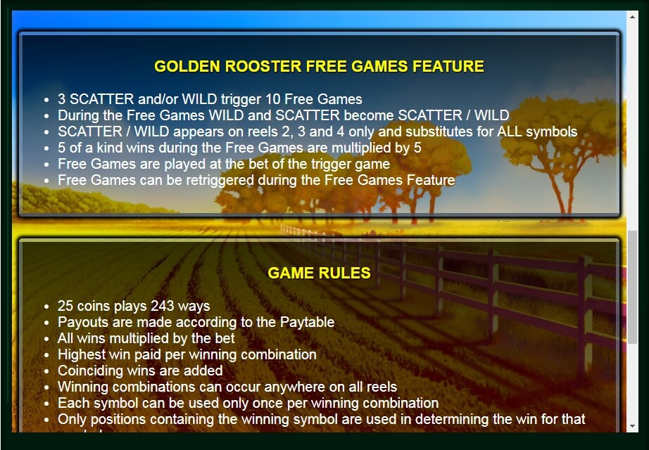 Golden Rooster is both a wild and a scatter element. During the Free Spins program, the wild cock and the scattered target pendant will become the Scatter/Wild element. If the gamer obtains three the scatterwild elements, he will dive into the Golden Rooster bonus program and obtain 10 free rotations.