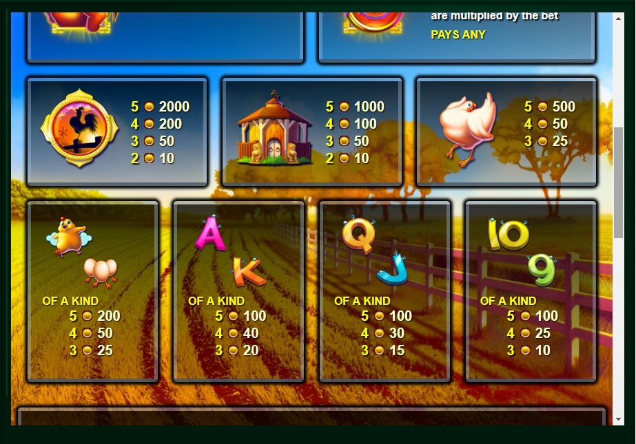 If the gamer obtains five cocks on the fence, he will grab a golden jackpot egg of 2000 points. A cock is a wild element which can occupy a place of any element on the reels No 2, 3 and 4 to build a winning composition. Target pendant is a scatter element which pops on the reels No 2, 3 and 4 only. All the wins obtained with the scatter will be multiplied.