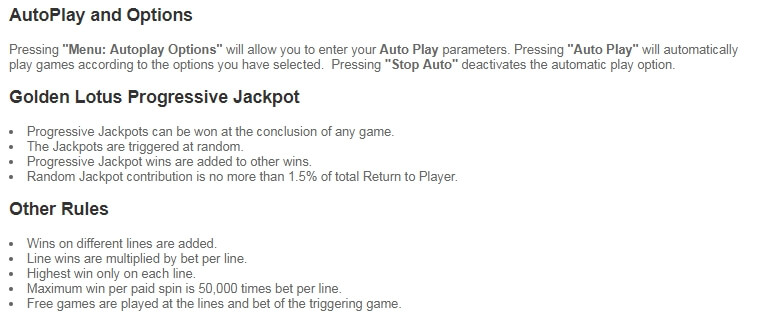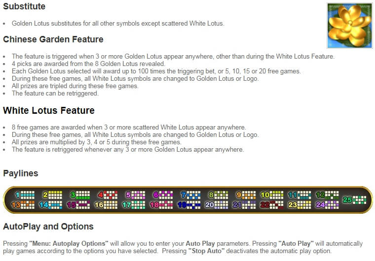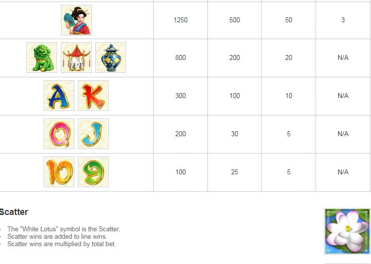 Golden Lotus has simple rules – collect similar items within same reel and you will increasers. To know about winning combination, you can see the list in the menu. For example, when you will get 3 lotuses on the same line, then, you will activate the special mini-game. There you will need to choose four correct golden lots, within 8 golden lotuses.