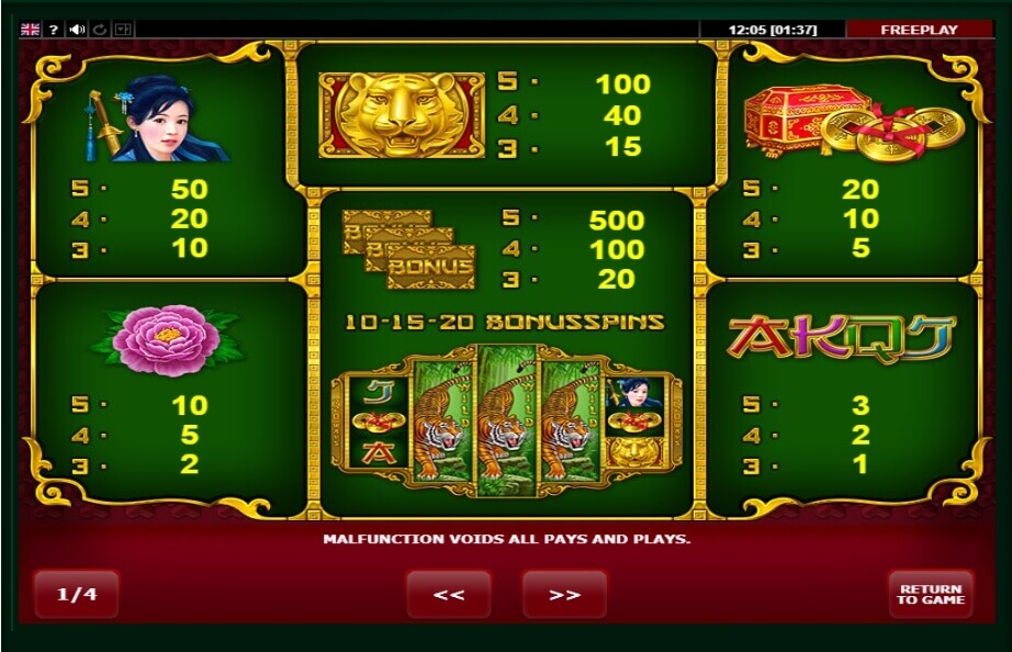 A scatter symbol is a Chinese woman. It can be found on any reel and works both as a multiplier and as a free spins activator. The scatter symbol, as one of the most influential ones in the game, has the highest prise as well. It can bring 100 coins to the player if there are five such symbols on the screen at the same time.