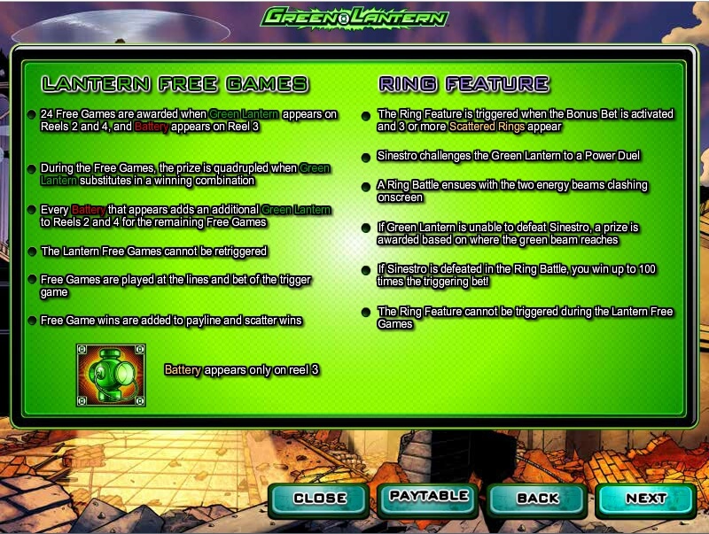 Three levels in the slot – Mini, Minor, Major Jackpot. It’s the really nice amount of the money! As the minimum you will get £ 200,000 reward. Licensed video slot Green Lantern supports formats of the Windows desktops and Mobile devices — Android / iOS / Apple phones.