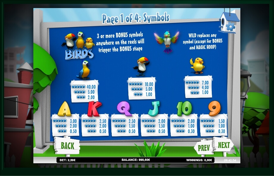 Streetlights indicate that even at night its light, so it is safe to walk. Satellite antennas on the houses are the proof that comfortable conditions were created for the residents here. The blue sky at the top causes a sense of peace and lightness. The population of the town is a variety of birds. The playing field of the presented automaton consists of five drums and 243 ways of composing combinations. Drums are decorated with a frame, made of planks that are painted white.In the upper right corner, you will notice a birdhouse with a drawn gear. With it, you can make the gameplay as comfortable as possible. Under the drums is the control panel, where there is a key for the determining of your bet – BET. The reel start button is SPIN, which changes to STOP during the rotation period.The Autostart mode is AUTOSPIN. To familiarize yourself with the rules of the slot machine and the payout ratios, you need to go to the PAYTABLE information section. The melody in the video slot is unobtrusive and funny. To start a round, choose the bet amount. There are five keys for this, indicating different denominations of the loan. To select a desired one, click on the cell on the right.