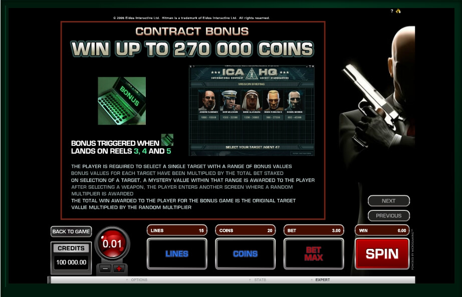 The Hitman video slot has 5 reels and 15 active lines. The number of coins is fixed: for each line, you can put from 1 to 10 coins, and the range of rates varies from 1 to 50 cents, which will please both beginners and experienced players. The jackpot in the game is equal to 4000 coins, and the payback rate of the slot is extremely pleasant – 95.8%, which is a brilliant indicator for the Microgaming video slots.