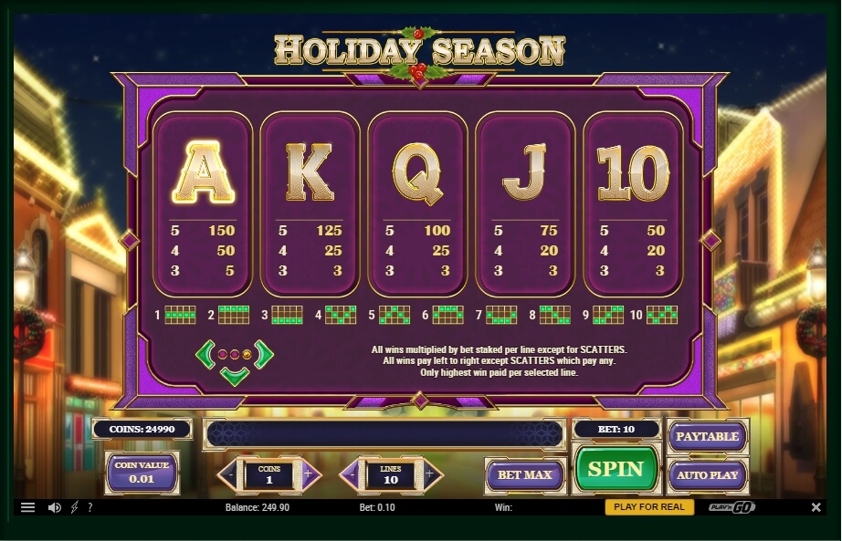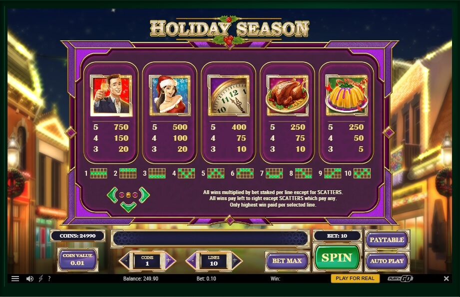 A large green button activates the rotation of the reels. Informative windows will familiarize the gamer with the current parameters of the game process, and the settings section will allow you to adapt the game to your taste and needs. The Holiday Season video slot contains 5 dynamic drums, on which there are 10 lines. The standard playing field makes the gameplay simple and accessible to the beginner.