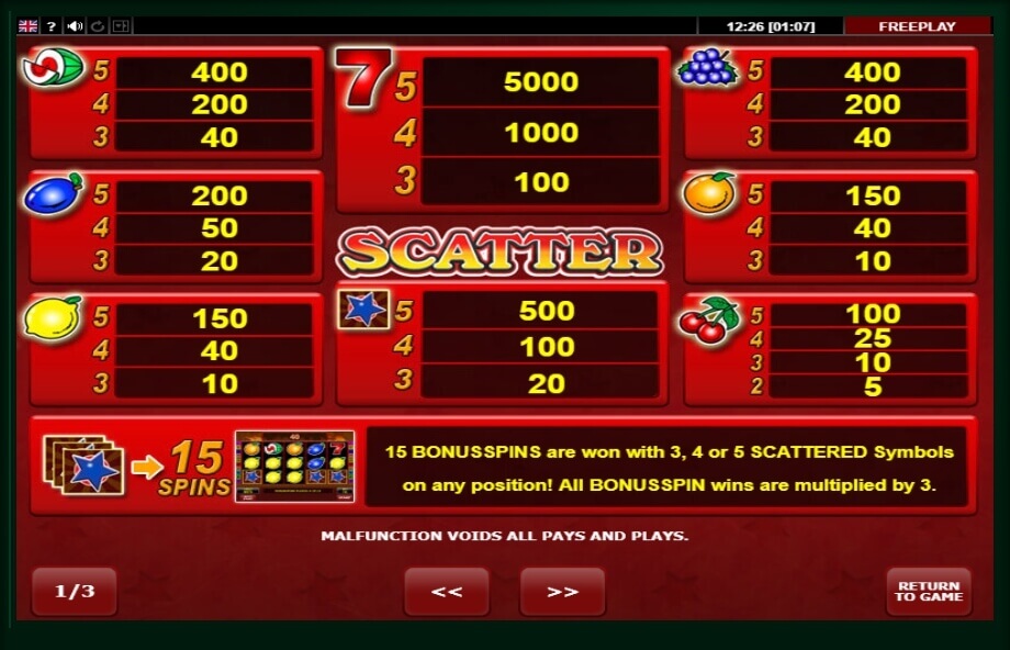 A bonus round will be opened after 3-5 blue stars appear on the playing field. For this, the player is given an opportunity to perform 15 rotations, during which you can win repeated rotations.