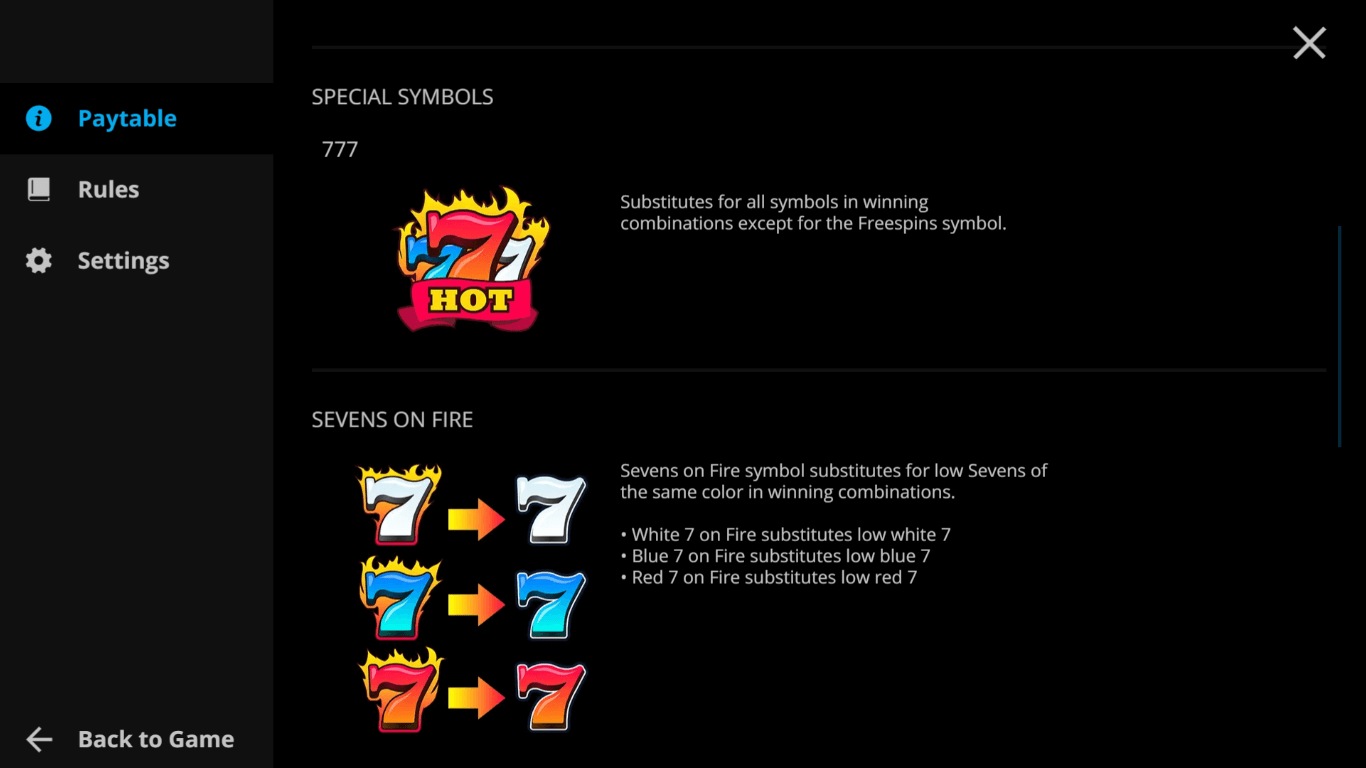 Sevens on Fire. In Hot Triple Sevens, there’s more than one Wild. Every seven surrounded by flames can act as a Wild symbol for sevens of the same color. For example, if a combination lands with two regular white sevens and one fiery seven, it will count — and pay — as a complete line of three white sevens.