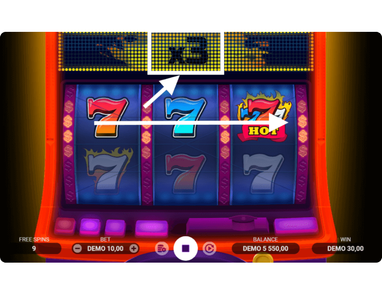 Freespins Symbol. The only symbol in the game that isn’t a 7 is the Scatter, which also serves as the Free Spins icon. If you manage to land three of these symbols anywhere on the reels — regardless of paylines — you’ll trigger 10 free spins, during which all winnings are multiplied by 3x. On top of that, the game awards an instant payout equal to seven times your current bet, adding an extra reward to your bonus round wins.