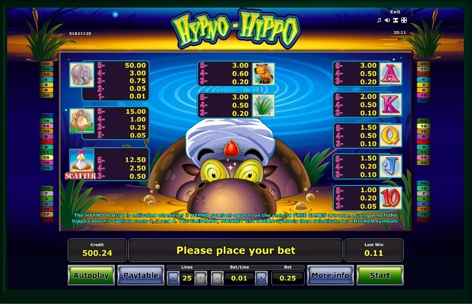 The interface of the video slot is modern and at the same time convenient and understandable. First, the participant needs to click on the blue button with the inscription “paytable” that opens access to information about all the features of this emulator. In addition, here you will learn the paytable that describes the properties of all symbols and their coefficients.