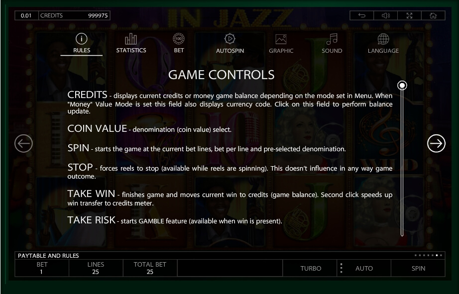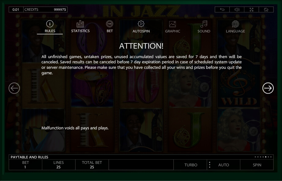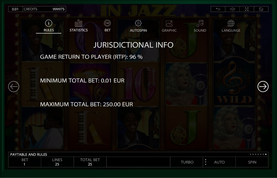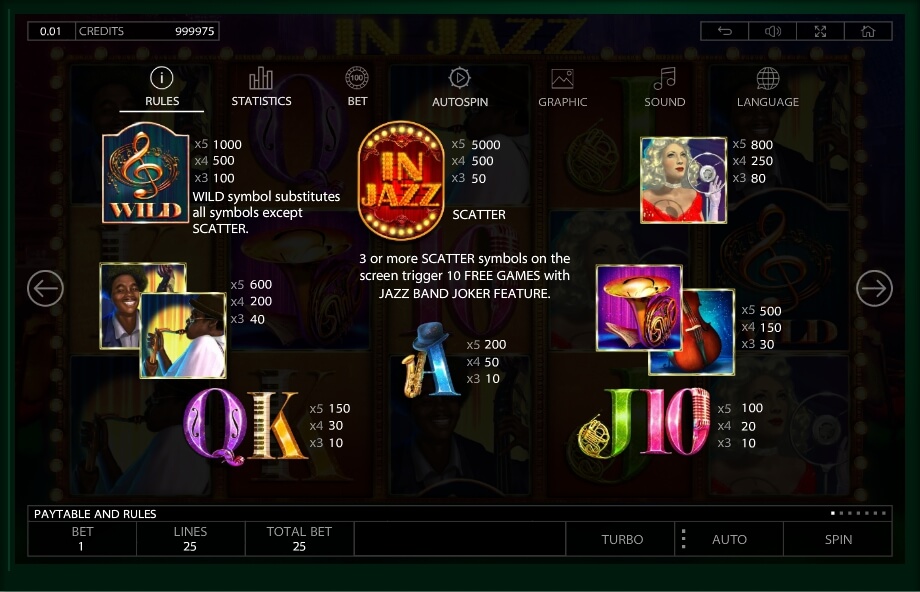 There is nothing in the world as perfect, as the In Jazz casino, being created by Endorphina Studio. These guys took their inspiration from the early 20th century, when Jazz was on the highest point of its popularity, even higher then rock-n-roll. What is more important, the game designers wanted to represent this theme in the best light they could. The gaming field is full of bright colours and very detailed characters. You can literally feel the emotions that developers tried to deliver, immersing in an atmosphere of the Chicago City, which is beautifully depicted. Just as you might guess, the main characters of the In Jazz online are the Afro-Americans. They do everything needed to make good music. Moreover, you can hear it in the sound representation for the slot. Be sure, it is phenomenal. Besides, a gamer doesn’t have to pay anything in order to start playing. The game`s trial version can be launched on any device – from a personal computer to a tablet and a mobile phone. It contains everything from the original project, except an ability of moneymaking and storing your data on the cloud drive.