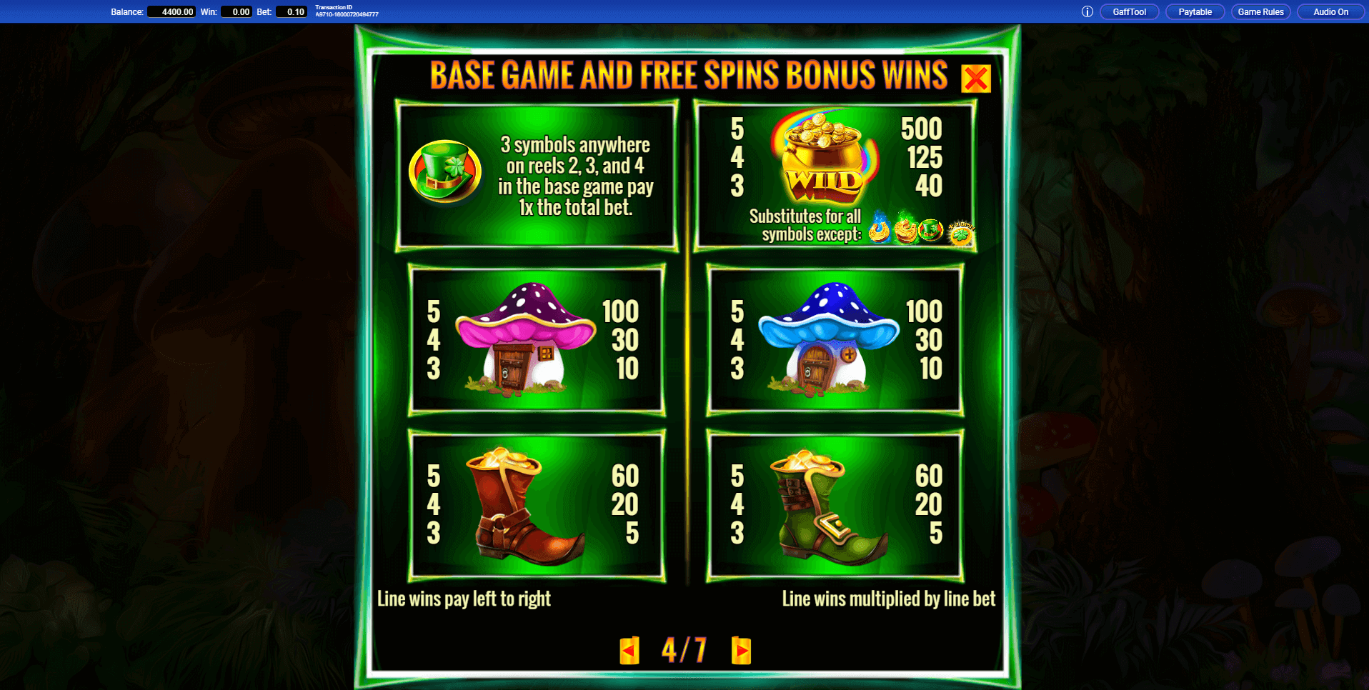 In demo mode, you can experiment with different gameplay scenarios. Click the button in the lower-right corner to open the Gaff Tool menu. From there, choose a scenario — for example, triggering free spins or landing a Wild — to see how each feature works in action.