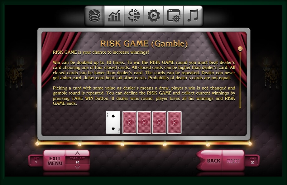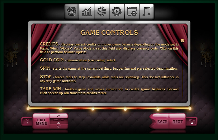 To manage your bets, you can use “Total Bet” option. What is more important, you can choose the line to bet with the use of the “Lines” section. Just don’t forget, all it can be done to simplify the gameplay. Being afraid that it will be too hard for you to play, use the “Auto” function. This automatic mode was added by the creators, so you could play the game even being not at home. Activate it, and the project itself will put your money at stake for a specified number of times. Look to the ends of the gaming reel. There you can find squares with numbers. They represent the total number of lines that you can use within the game. Here are twenty of them. A gamer can even put all money at stake by simply clicking on the “Max Bet” option. Alternatively, you can exit the game with the “X” mark in the upper right corner.