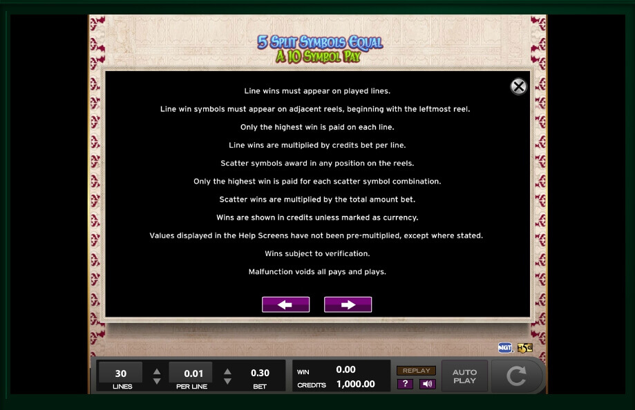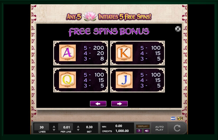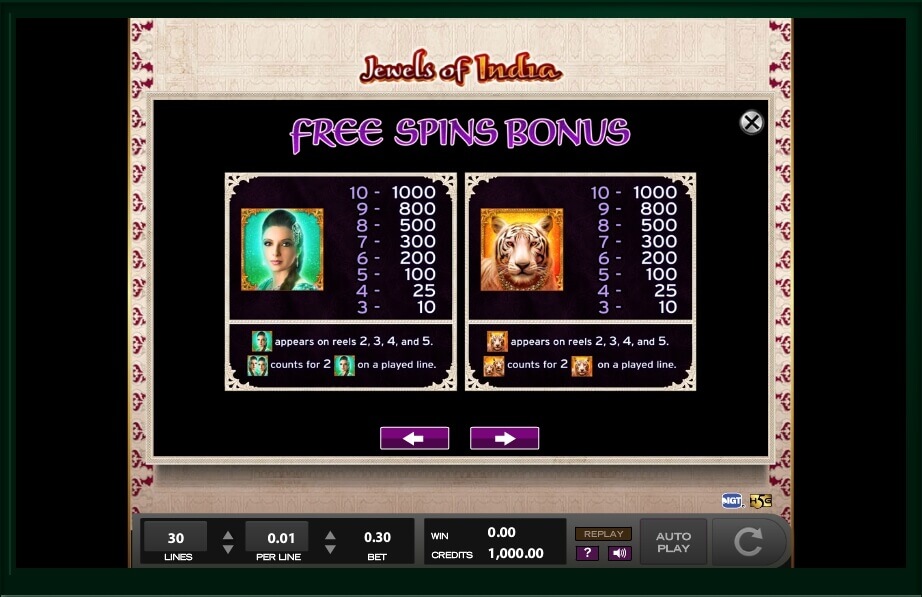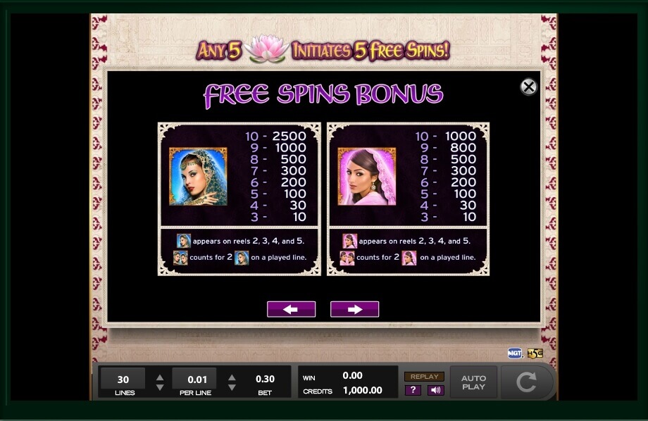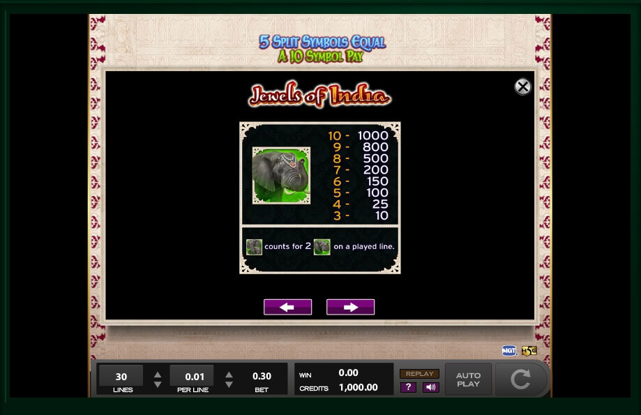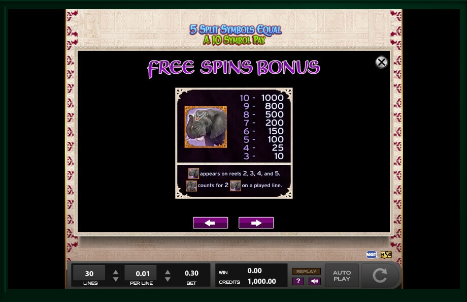 If you collect 3 symbols of elephants or tigers, you will get 10 credits; however, if you get 10 of them, you will be able to get 1000 credits to your balance. If you get the picture of the princess, you will get 10 credits for 3 pictures, 30 credits for 4 pictures, 100 credits for 5 pictures, 200 credits for 6 pictures, 300 credits for 7 pictures, 500 credits for 8 pictures, 1000 credits for 9 pictures and, finally, 2500 credits for 10 pictures. As you can see, it is possible to get a lot of money here. Some symbols can increase your prizes 2 times and you should do your best to find as many as you can.