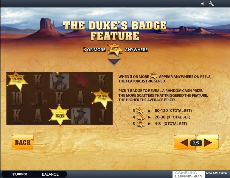 John Wayne is a wild himself and it can bring you a high payout at the end of the game. Just catch three John Wayne symbols on the screen and you will be able to get x3000 multiplier of your cash! Moreover, wild symbols can replace all other playing icons in this video slot machine. Moreover, there is also a scatter symbo that can give gamblers a chance not only to boost cash and get more money, but also to play three free spins. During free spins the gambler can spin reels not being afraid of a money loss!
