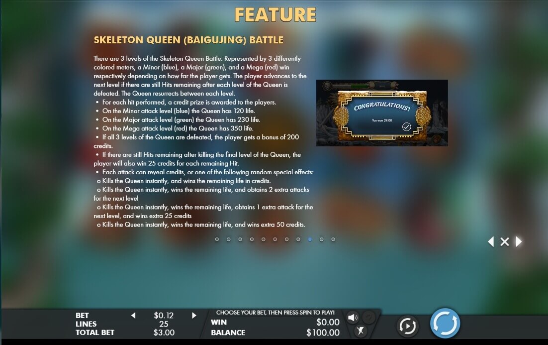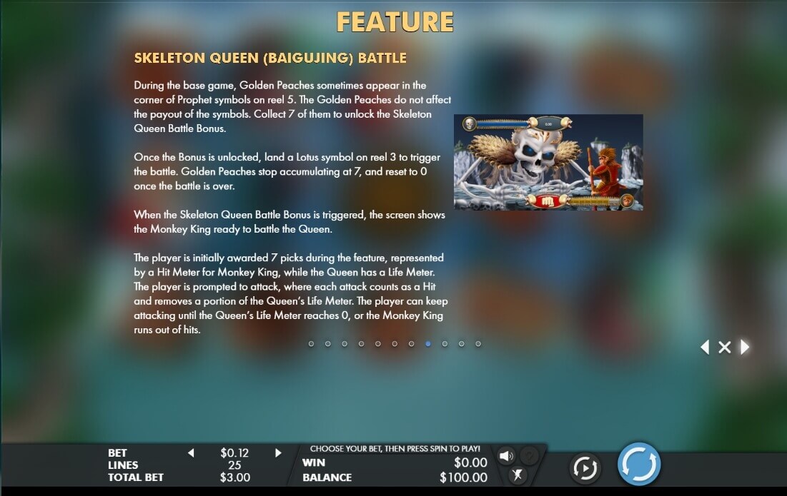 The Monk is the fourth bonus: Monk and Lotus activate re-spin on the third reel, Enemies won’t move for this period of time. Then the Monk will enlighten them to get 100 payouts for every Enemy. The fifth bonus is the Skeleton Queen battle. If the player picks all peaches, he/she will activate the bonus battle. Lotus triggers the battle on the third reel. There will be 7 attempts to attack and become a winner.
