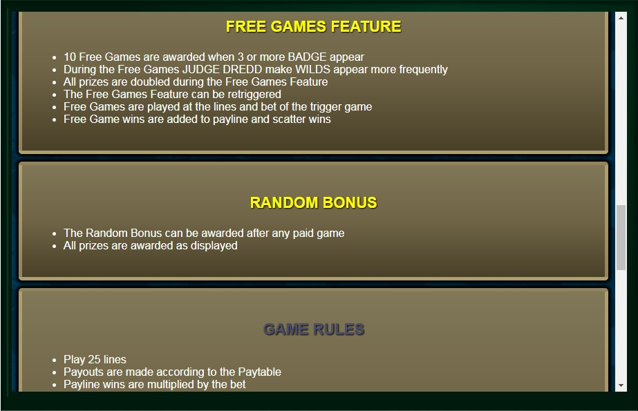 There is also a Judge Dredd feature. The most important feature of the game is the free spins. They are triggered when you get 3 scatters on the reels and you win 10 free spins with all prizes doubled.