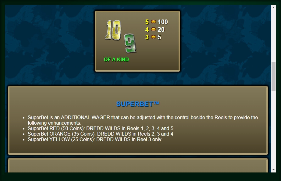 This online-game has a wild picture which is Dredd himself and a scatter image which is a badge. The 1st one in base play appears on reel 3 only but if the user activates the superbet option it will land on all reels. This also increases the bet level accordingly.